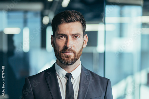 Close up portrait of businessman with beard looking at camera, serious man in modern office