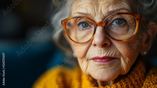 Close up portrait of senior woman wearing stylish round glasses and contemplating