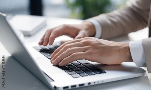 Close up portrait typing keyboard on laptop computer. Working online on white table at office