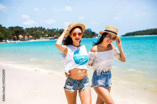 Close up summer portrait of young sexy pretty woman, wearing simple casual trendy white tops and bright sunglasses, smiling having fun on vacation in tropical country. Best friends laugh and go crazy