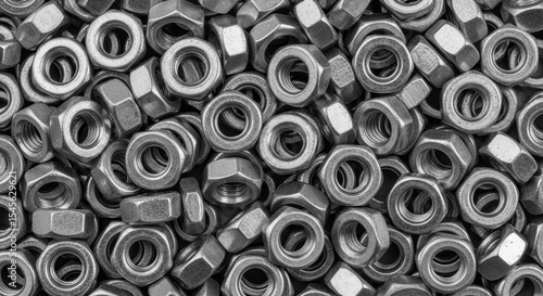 Close up top down view of a dense pile of numerous small hexagonal matte silver metal nuts