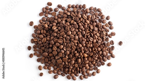 close up top view on roasted coffee beans pile heap on white background