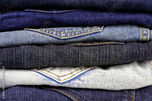 Close up various type and color of denim fabrics, Jeans trousers folded and stacked.