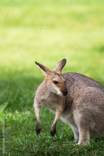Close up view of adorable adult kangaroo standing on the grass. Wildlife animal concept in its natural environment. Australia. Symbol of Australia. Brisbane.