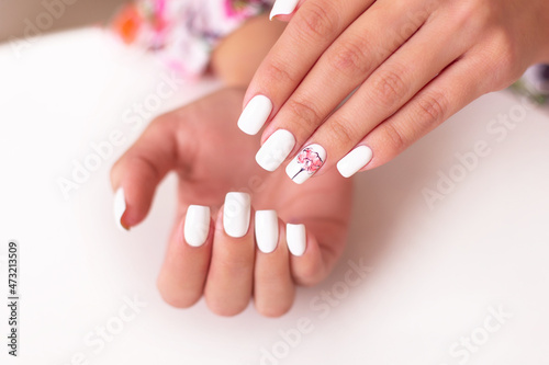 Close up view of beautiful female hands with romantic manicure nails, pink and white gel polish, peonies flowers design