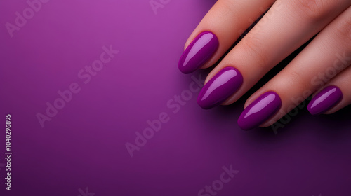close up view of hand with beautifully manicured nails painted in vibrant purple color, set against matching purple background. glossy finish adds touch of elegance and sophistication