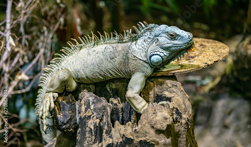 Close up view of iguana sitting on the bark of a tree among the green at the zoo