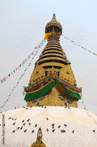 Close up view of the gold colored top of buddhist Swayambhunath stupa, also known among tourists as Monkey Temple, with traditional "Eyes of Buddha" painting. Theme of travel in Kathmandu, Nepal.