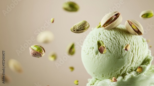 Close up view showcasing a scoop of green pistachio ice cream,Pistachio green ice cream with nuts,Top view of ice cream isolated for package design of pistachio ice cream,banner menu concept.