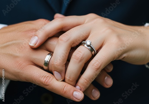 Close up Wedding Rings on Newlyweds Fingers Bridal Jewelry Detail Marriage Symbol Love Union Gold Diamond Bands Together Hand Skin Texture
