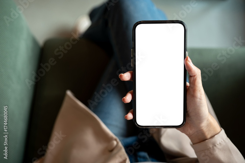 Close up woman's hand holding blank screen smartphone while sitting on green sofa in cafe or lounge.