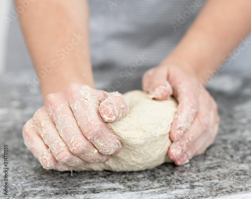 Close up woman`s hands making dough in the kitchen at home