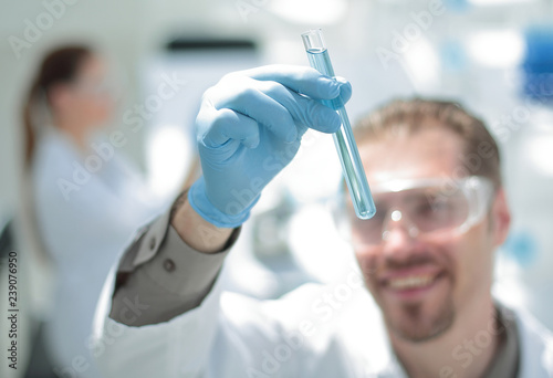 close up.smiling scientist looks at the tube with liquid