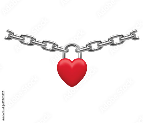 Closed heart lock hanging on chain isolated on white. Realistic vector 3d illustration