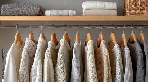 Closet with hanging clothes and shelf with folded items isolated on white background