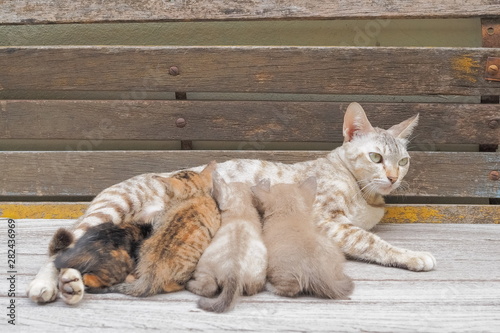 Close-up a mom cat feeding milk to her baby kittens on wood texture background.
