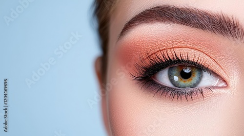Close-up eye makeup, peach tones, beauty shot, studio background, cosmetic advertising