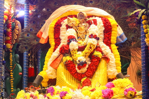 Close-Up Golden Lord Murugan Idol and Vel Decorated with Jasmine and Colorful Flowers and Peacock Feathers. South Indian Hindu Festival, Tamil Devotional Worship and Traditional Spiritual Celebration