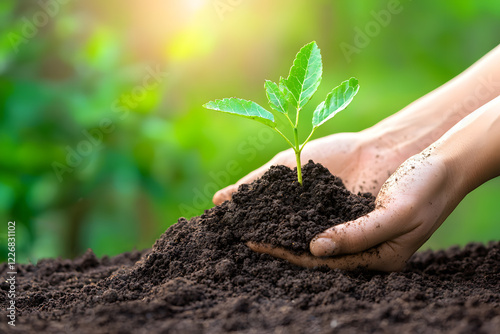 Closeup hand of person holding abundance soil with young plant. Hands holding a sprouting plant in soil