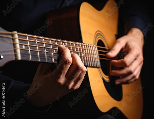 Close-up hands playing acoustic guitar with fingers positioned on frets and strings in warm intimate lighting