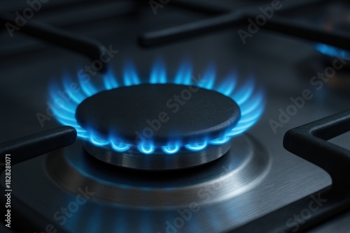 Close-up horizontal photograph of a modern gas stove burner with vivid blue flames, cast iron grate, and brushed stainless steel surface, captured from the front with a realistic, detailed perspective