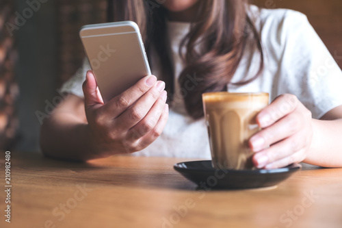 Closeup image of a woman holding , using and touching a smart phone while drinking coffee