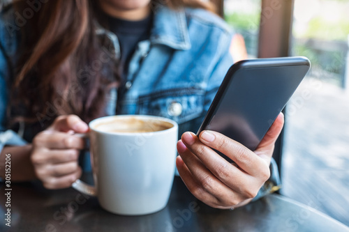 Closeup image of a woman holding and using mobile phone while drinking coffee