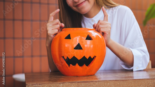 Closeup image of a young woman playing with a Halloween pumpkin bowl for Halloween festival concept
