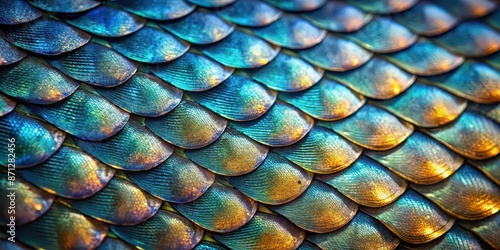 Close-up image of shimmering fish scales with intricate overlapping pattern , Fish, scales, close-up, texture, pattern