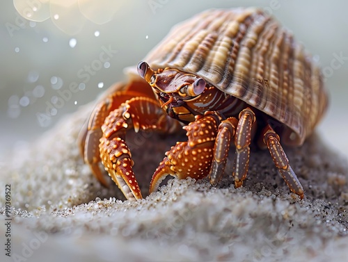 Close-up macro shot of a hermit crab with its shell partially buried in the sand, the detailed textures of the shell and sand creating a striking underwater composition