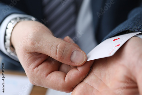 Closeup man in suit hiding ace card in sleeve. Gaining advantage in specific circumstances. Forcing to make concessions by creating deception. Identification exposure targets. Foul play