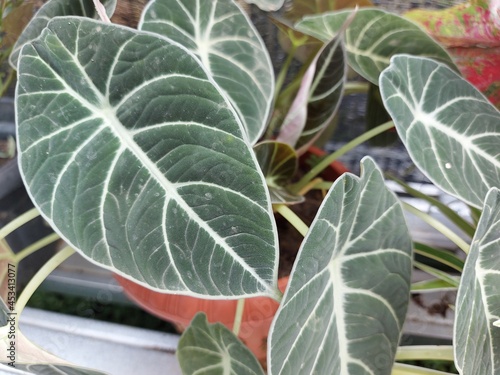 Close-up of a beautiful Alocasia houseplant with blurred background and has a unique shape like an elephant's ear.