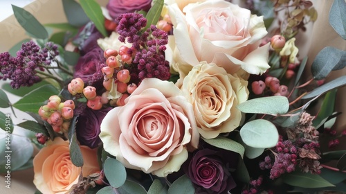 Close-up of a beautiful and romantic rose and berry flower bouquet