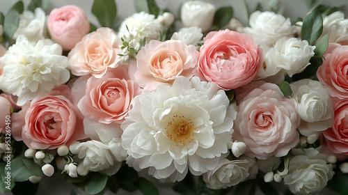 Close-up of a beautiful arrangement of pink roses and a white peony.