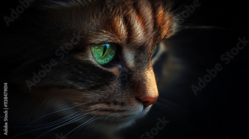 Close-up of a beautiful cat with striking green eyes and a detailed fur coat in low light, showcasing its expression and features.