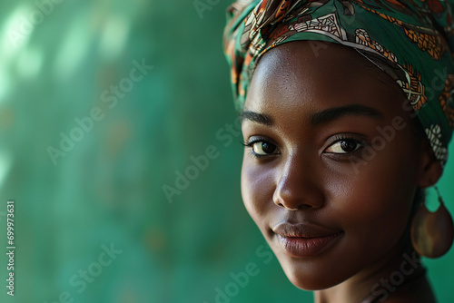 Close-up of a beautiful young woman in a traditional African head wrap on a green background, embodying cultural elegance.