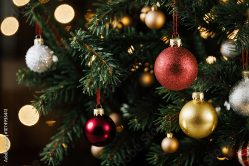 Close-up of a beautifully decorated Christmas tree with ornaments.