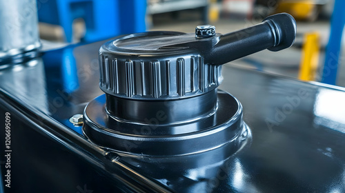 Close-up of a black industrial machine component, factory background, showing details for manufacturing or industrial website