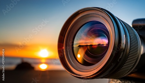 Close-Up of a Camera Lens Reflecting a Sunset or Travel Scene in the Glass