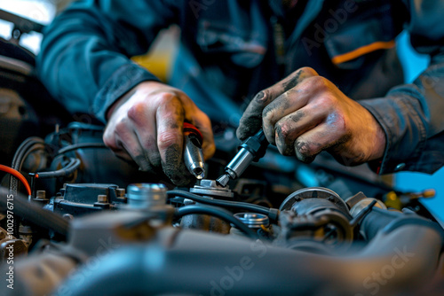 Close-up of a car engine being repaired focusing on the mechanic's hands and tools