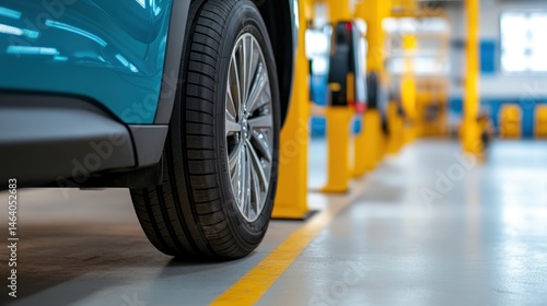 Close-up of a car tire in a brightly lit indoor parking garage with yellow pillars and marked parking lines.