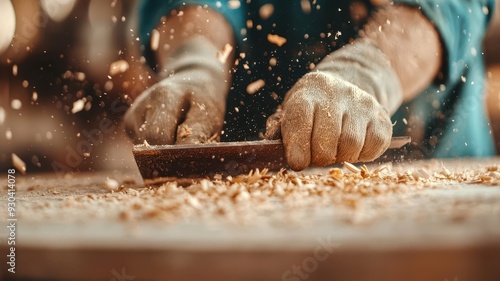 Close-up of a carpenter smoothing a piece of wood with a plane, wood shavings and dust in the air, photo realistic, dedicated craftsmanship