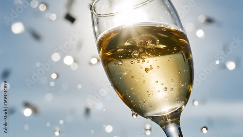 Closeup of a champagne flute filled with bubbly golden champagne, with confetti falling around it against a bright blue sky with sun rays