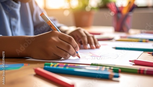 Close-up of a child's hands drawing with a colorful marker on paper at a wooden desk with art supplies.