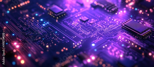 Close-up of a circuit board with glowing lights.