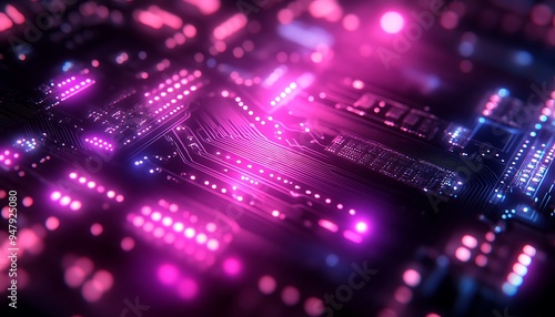 Close-up of a circuit board with glowing pink and blue lights.