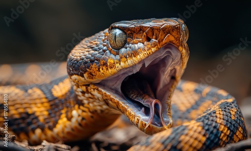 Close-up of a Colorful Snake with its Mouth Open, Showcasing Intricate Scales and Lively Colors in a Natural Habitat Setting, Capturing Nature's Beauty and Wildlife Details