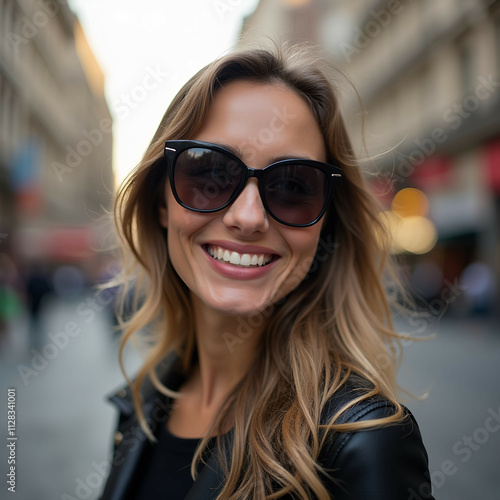 Close-up of a confident woman in sunglasses, smiling on a city street