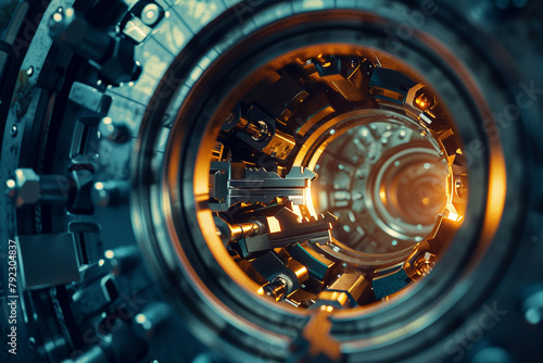 Close-up of a cyber key turning inside a complex 3D lock mechanism