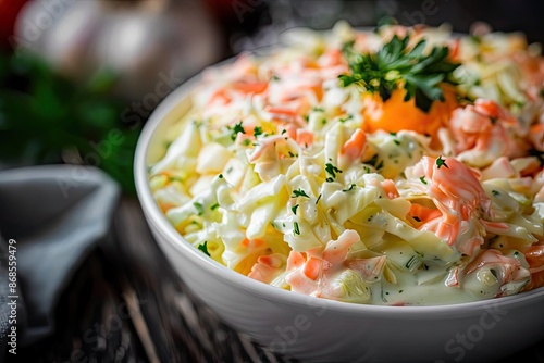 Close-up of a delicious homemade coleslaw in a white bowl, garnished with parsley. Perfect side dish for any meal.